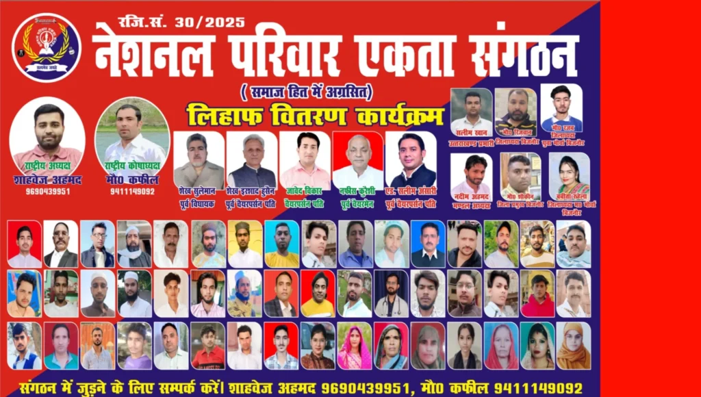 नेशनल परिवार एकता संगठन के राष्ट्रीय अध्यक्ष शाहवेज़ अहमद और राष्ट्रीय कोषाध्यक्ष मोहम्मद कफील ने बताया कि संगठन द्वारा हर वर्ष ठंड के मौसम में लिहाफ वितरण जैसे सामाजिक कार्यक्रम आयोजित किए जाते हैं। उन्होंने लोगों से अपील की कि वे अपने आसपास मौजूद जरूरतमंद परिवारों की मदद के लिए आगे आएं।